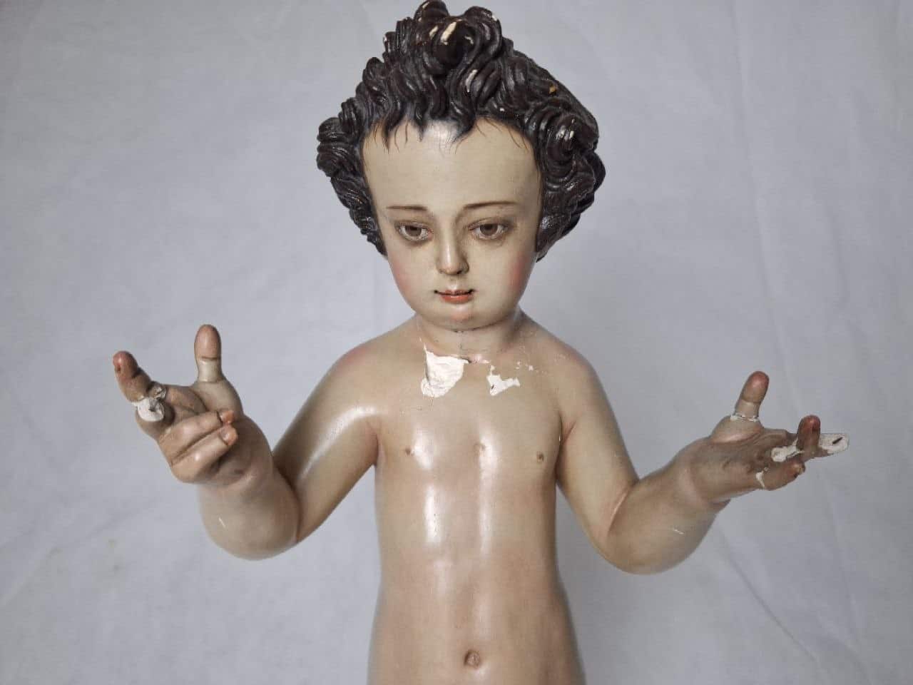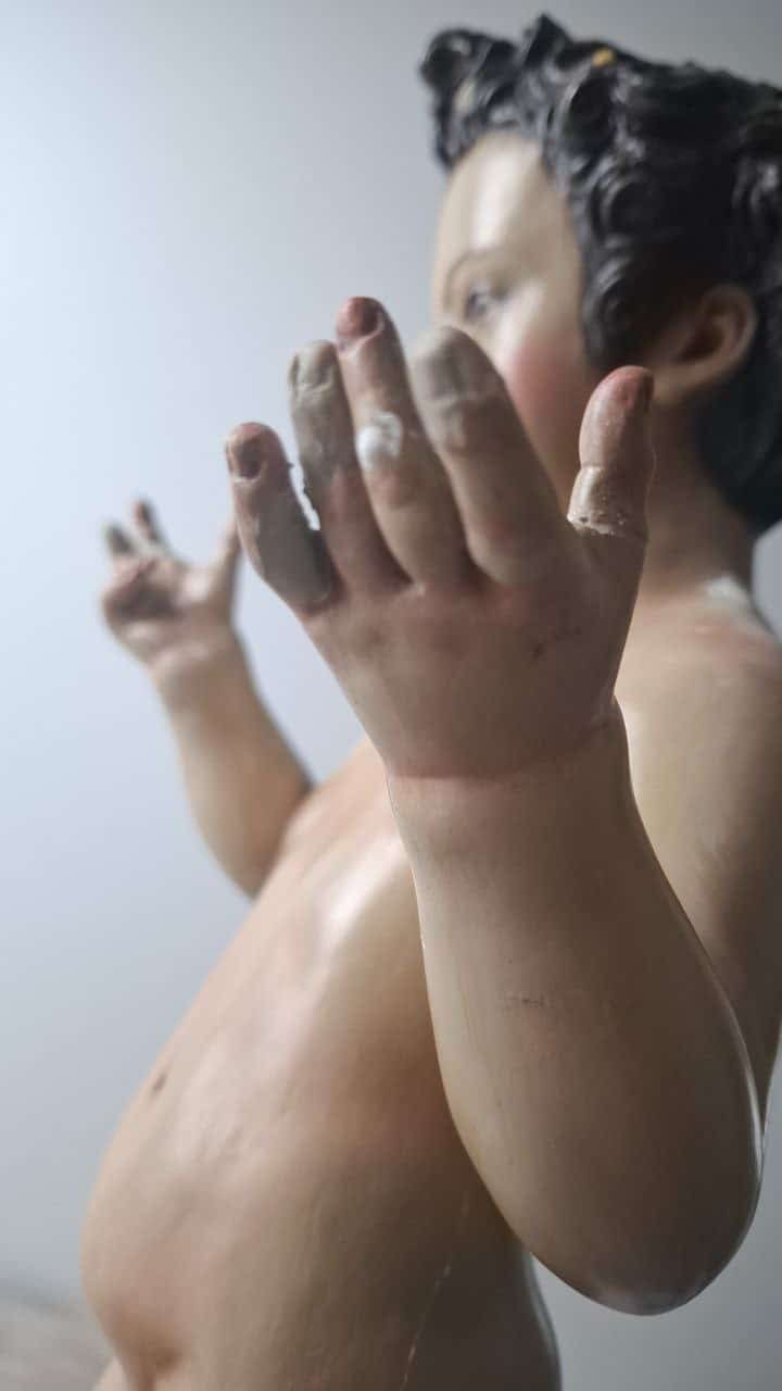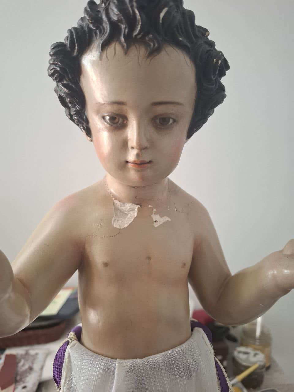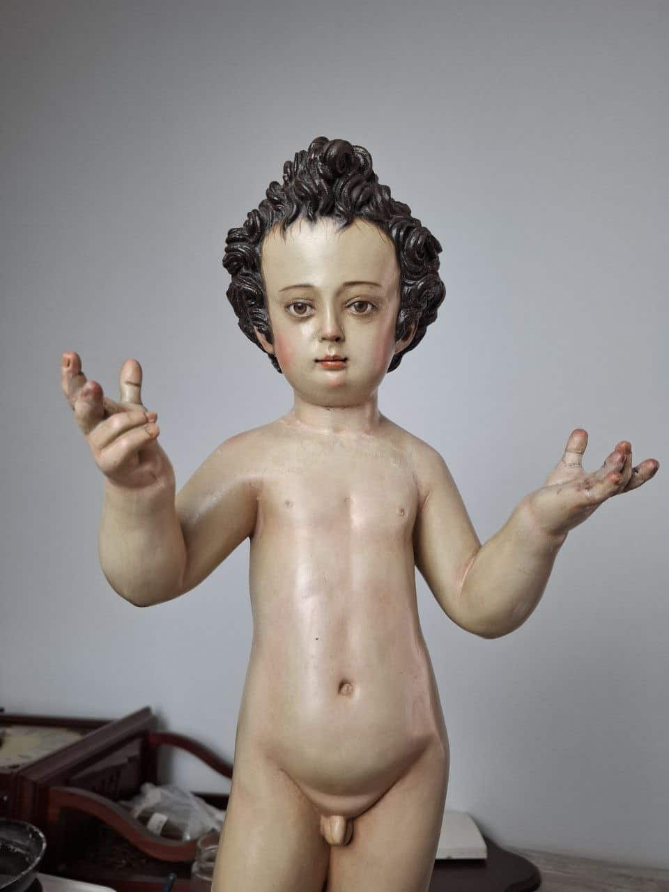 En la intervención se ha limpiado la capa de polícromia y estucado las lagunas, se ha realizado una restauracion volumetrica de los dedos faltantes y la peana, para finalizar con una reintegración cromatica donde se han usado pigmentos al barniz de @leal.productos